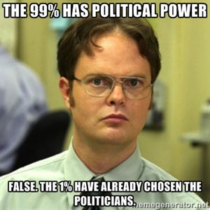 If we dont like what our society has become, we need to chamge it. We cant change it by voting for bigger government. The 99% do hold the political power no matter what Dwight says in this meme.  We have to flex our brains and our muscles to show our government who the real boss is. If you want things to change, go out and change them…don’t vote for them!